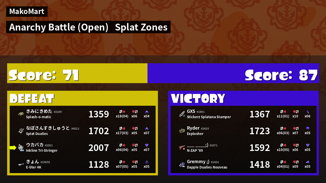 | Mode | Splat Zones - Anarchy Battle (Open) | ||
