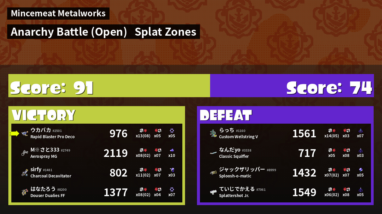 | Mode | Splat Zones - Anarchy Battle (Open) | ||