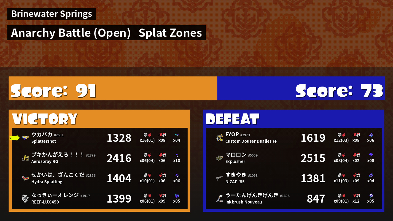 | Mode | Splat Zones - Anarchy Battle (Open) | ||