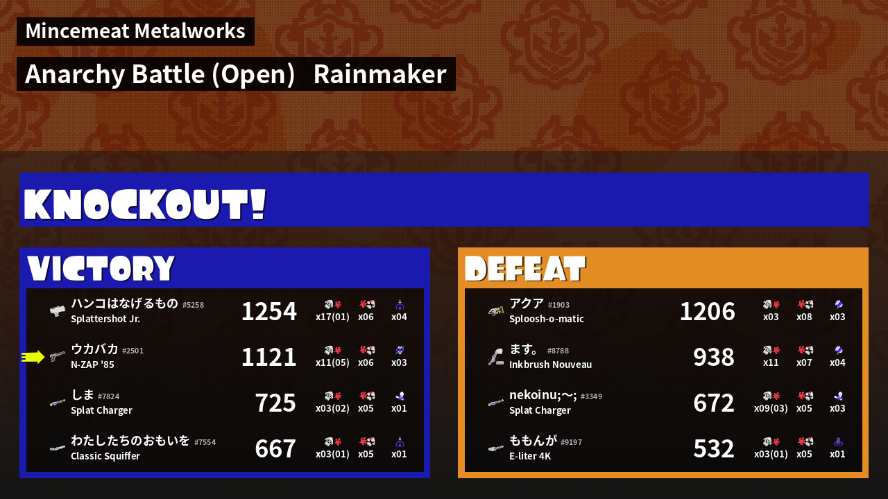 | Medals | Record-Score Setter #1 Splat Assister #1 Rainmaker Stopper | ||