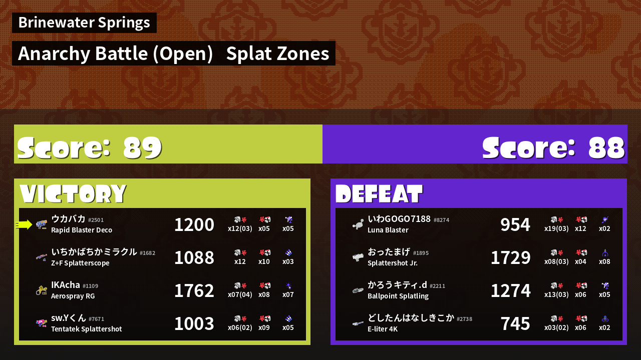 | Mode | Splat Zones - Anarchy Battle (Open) | ||