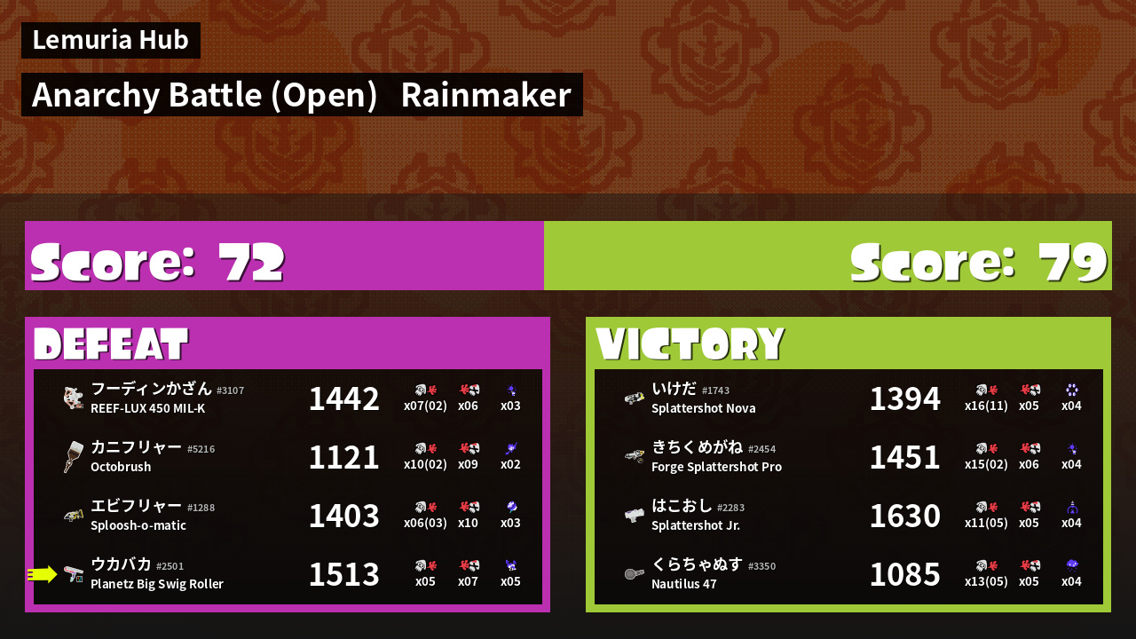 | Medals | #1 Turf Inker #1 Ink Consumer #2 Enemy Splatter | ||
