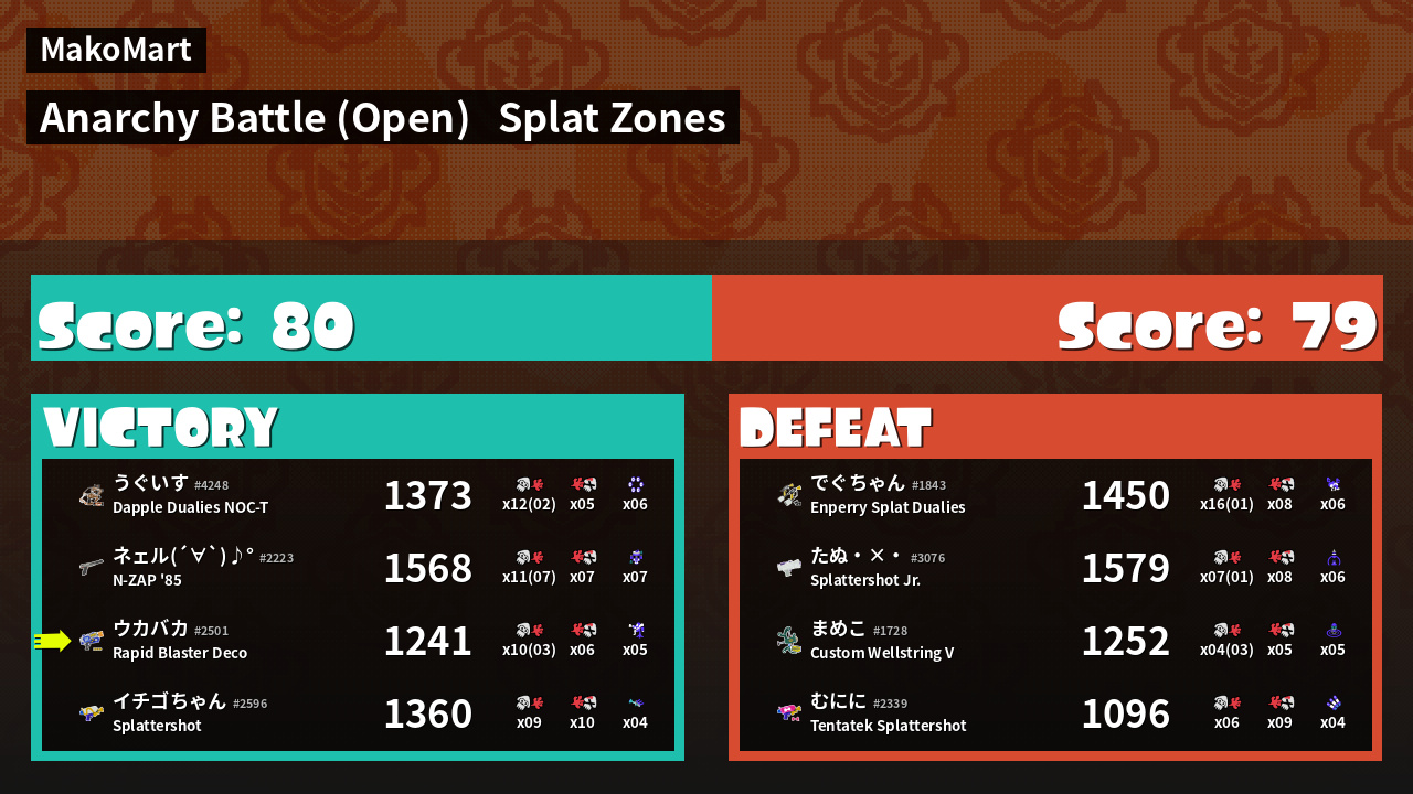 | Mode | Splat Zones - Anarchy Battle (Open) | ||