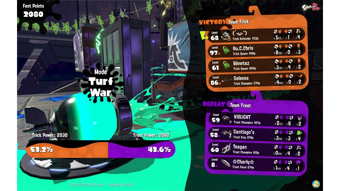 | Splatfest Title | Trick Defender 421 → Trick Champion 11 | ||||||||||||||||||||||||||||