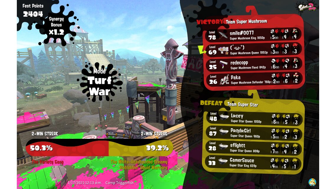 | Team Super Star The White-Headbanded Creamy Bloblobbin' Squid Warriors Win Streak: 2 | 3,477 | 17 / 16 | 1.06 51.52% | ||||
