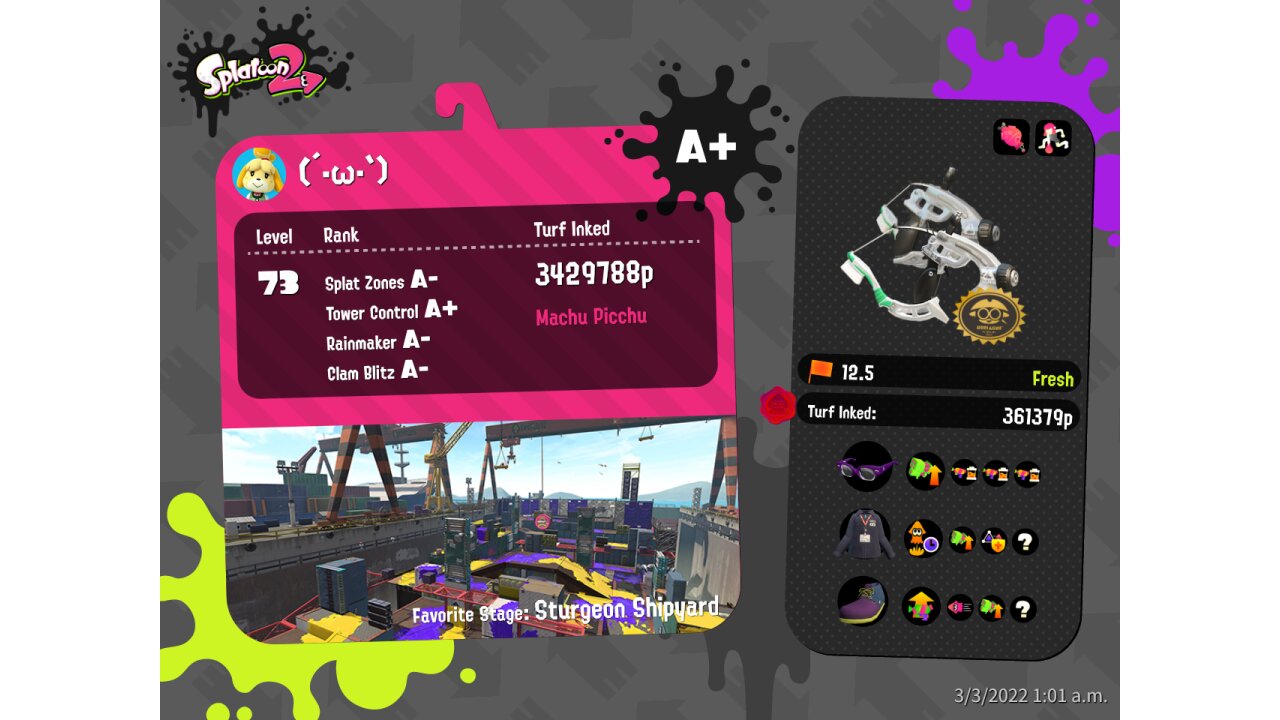 | Name | Weapon | Level | Rank | Inked | k+a/sp | k/d |