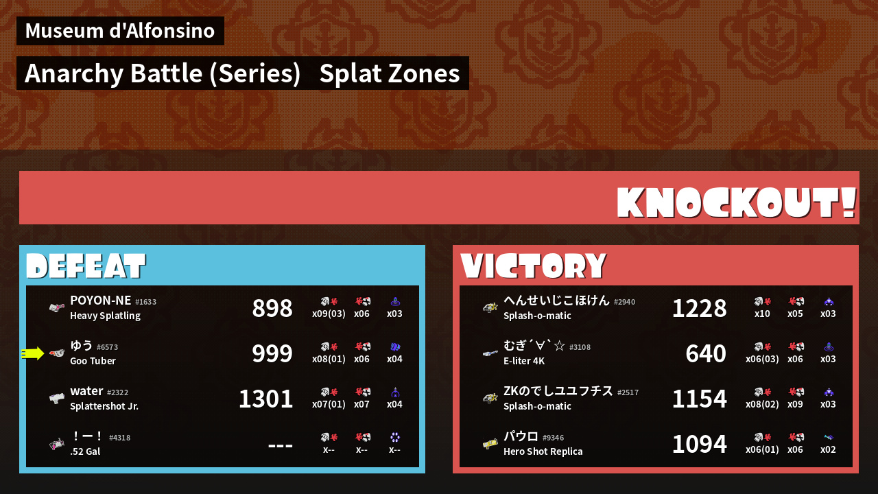 | Medals | #1 Splat Zone Guard #1 Enemy Splatter #1 Splat Zone Hero | ||