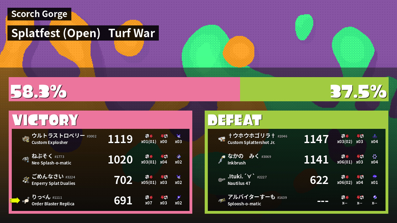 | Medals | #1 Overall Splatter #1 Enemy-Base Inker #1 Enemy Splatter | ||