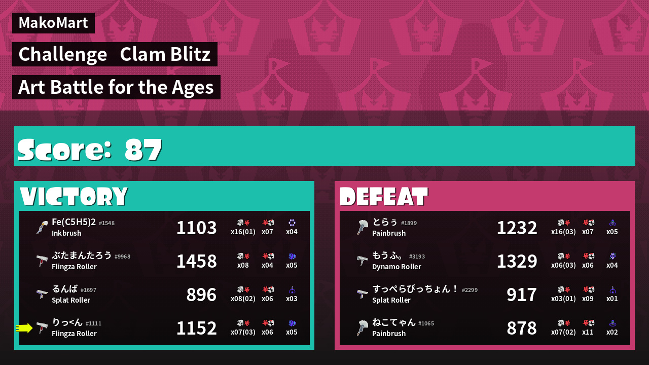 | Medals | #1 Splat Assister #1 Clam Stopper #2 Clam Carrier | ||