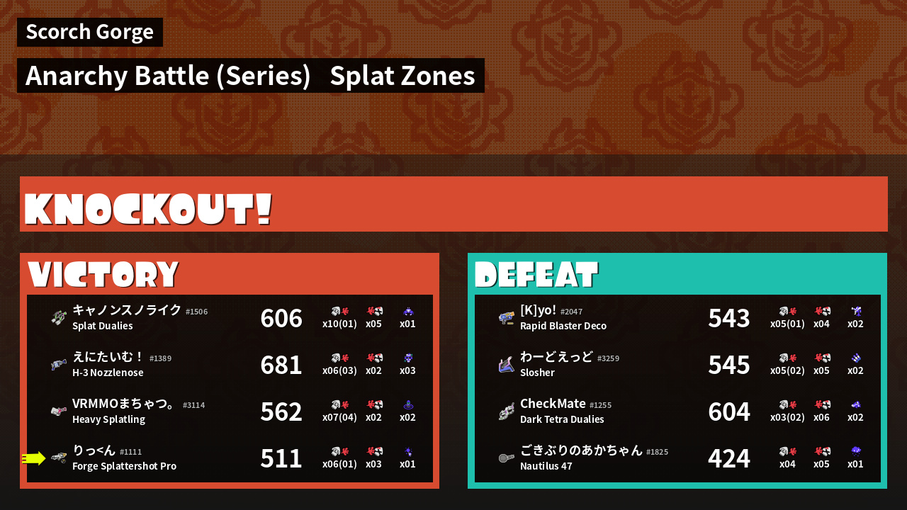 | ゲーミング人生  キャノンスノライク #1506 |  Splat Dualies                    | 606 | 9 + 1 | 5 | 1.80 |  1 | |