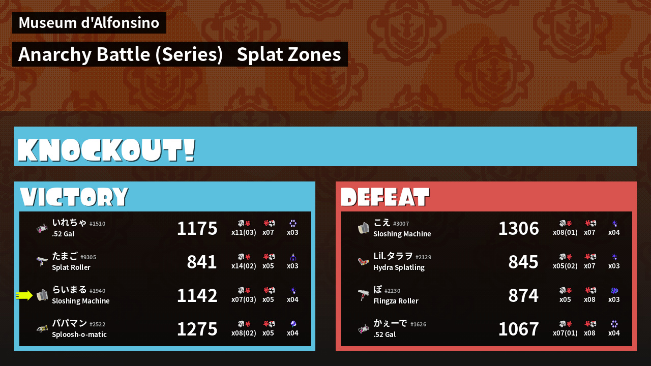 | Medals | #1 Splat Zone Inker #1 Splat Assister First Splat! | ||