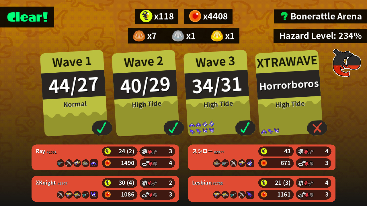 | Weapons | Jet Squelcher Recycled Brella 24 Mk I Splattershot Dread Wringer | Dread Wringer Jet Squelcher Recycled Brella 24 Mk I Splattershot | Recycled Brella 24 Mk I Splattershot Dread Wringer Jet Squelcher | Splattershot Dread Wringer Jet Squelcher Recycled Brella 24 Mk I |