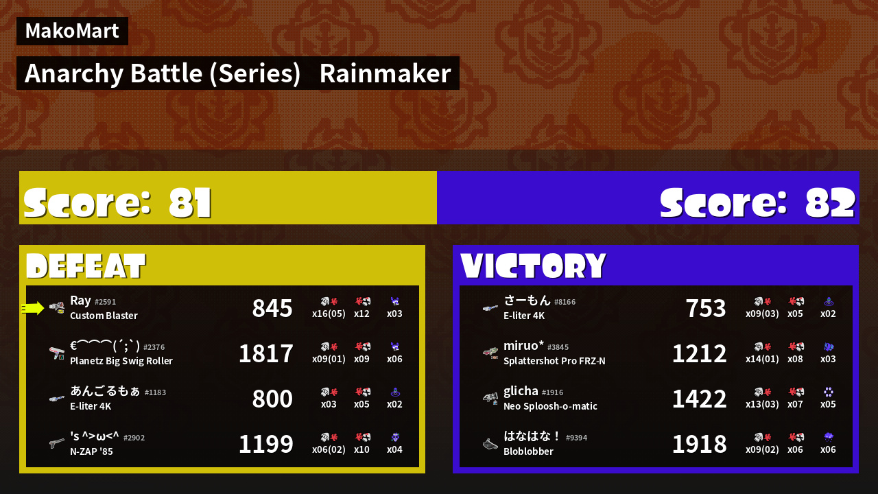 | Medals | #1 Overall Splatter #1 Enemy Splatter #1 Splat Assister | ||
