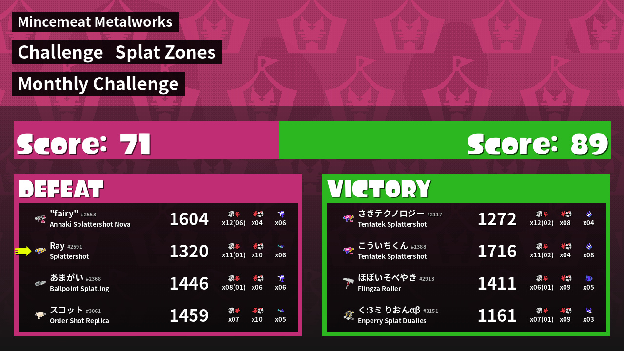 Kills / Deaths | 10 + 1 / 10 = Kill Ratio: 1.00 | ||