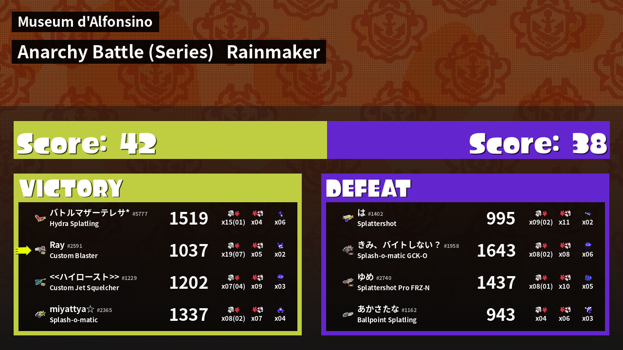 | Medals | #1 Overall Splatter #1 Splat Assister #1 Rainmaker Stopper | ||