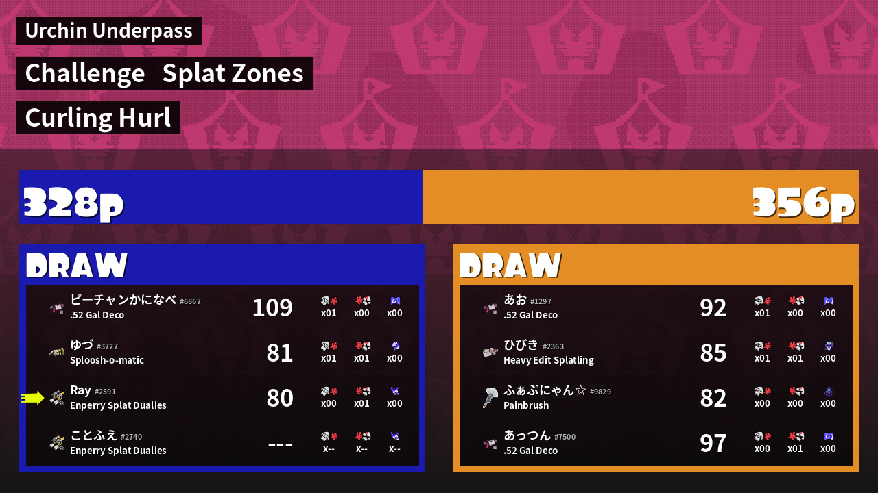 | Weapon | Enperry Splat Dualies ( Curling Bomb / Triple Splashdown) | ||