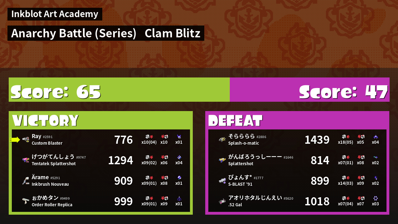 | Medals | #1 Overall Splatter #1 Clam Carrier #1 Super Jump Spot | ||