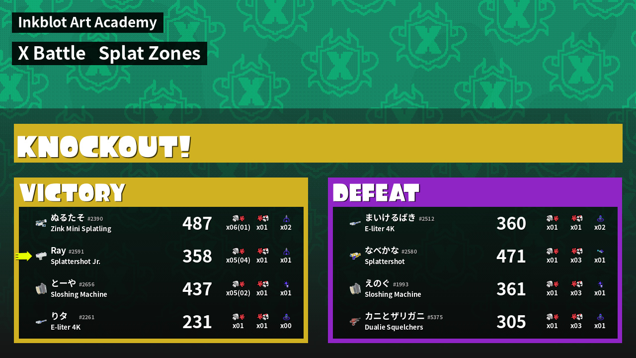 | Medals | #1 Splat Zone Guard #1 Splat Assister #1 Ground Traveler | ||