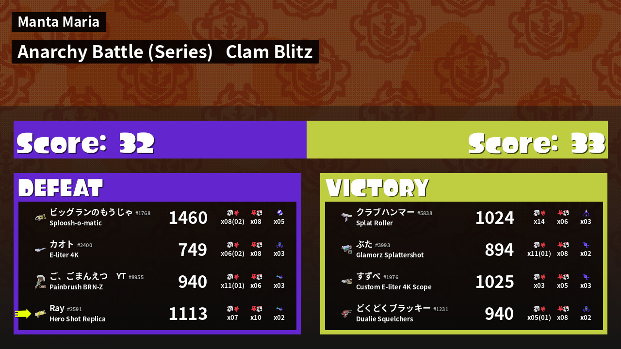 | Medals | #2 Turf Inker #2 Popular Target #2 Enemy Splatter | ||