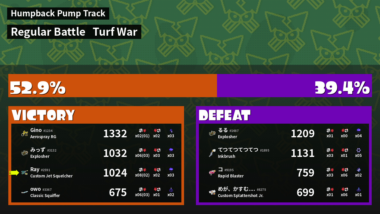 | Medals | #1 Overall Splatter #1 Enemy-Base Inker #1 Enemy Splatter | ||