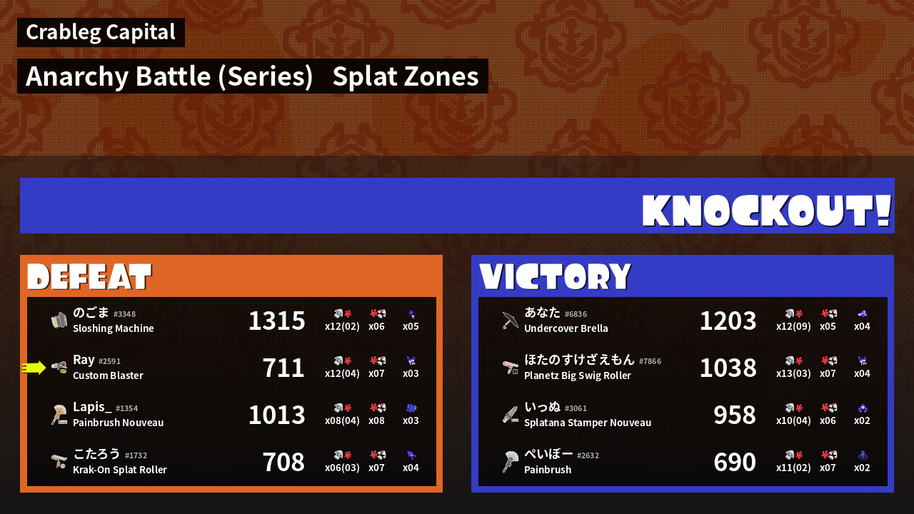 | Medals | #1 Overall Splatter #1 Splat Zone Guard #1 Splat Assister | ||