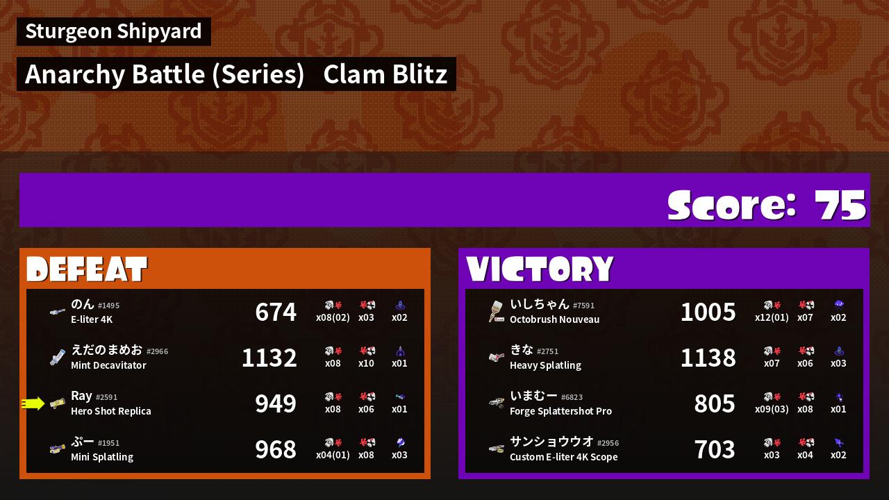| 肥美的頭皮  いまむー #6823 |  Forge Splattershot Pro                    | 805 | 6 + 3 | 8 | 0.75 |  1 | |
