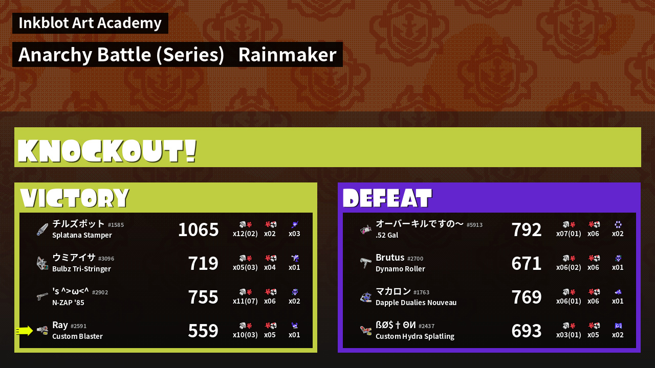 | Medals | #1 Rainmaker Stopper #1 Triple Splashdown User #2 Enemy Splatter | ||
