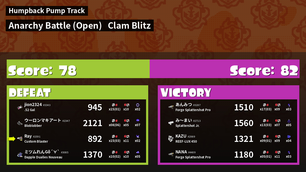 | Mode | Clam Blitz - Anarchy Battle (Open) | ||