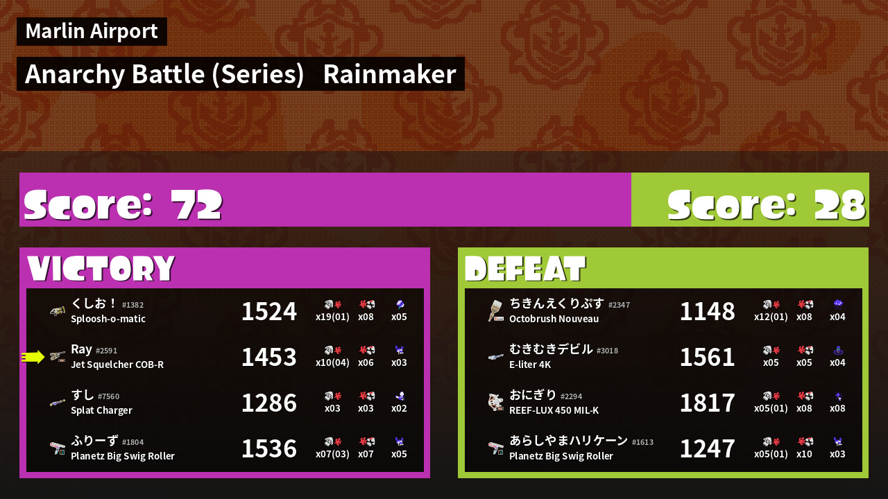 | Medals | Record-Score Setter #1 Splat Assister #1 Rainmaker Stopper | ||