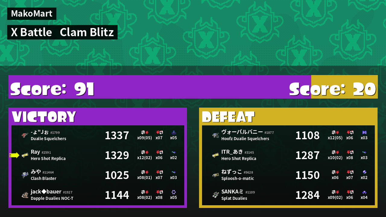 | Medals | #1 Overall Splatter #1 Enemy Splatter #1 Clam Stopper | ||