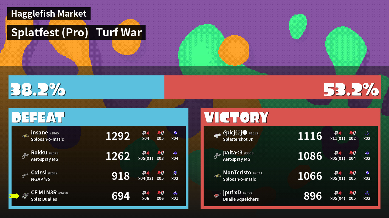 | Medals | #1 Overall Splatter #1 Enemy Splatter #1 Ink Consumer | ||