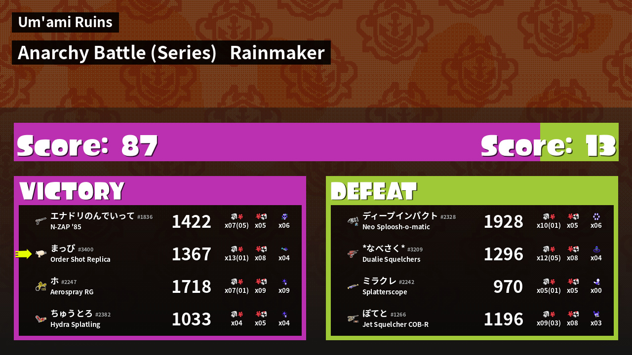 | Medals | #1 Overall Splatter #1 Enemy Splatter #1 Rainmaker Stopper |