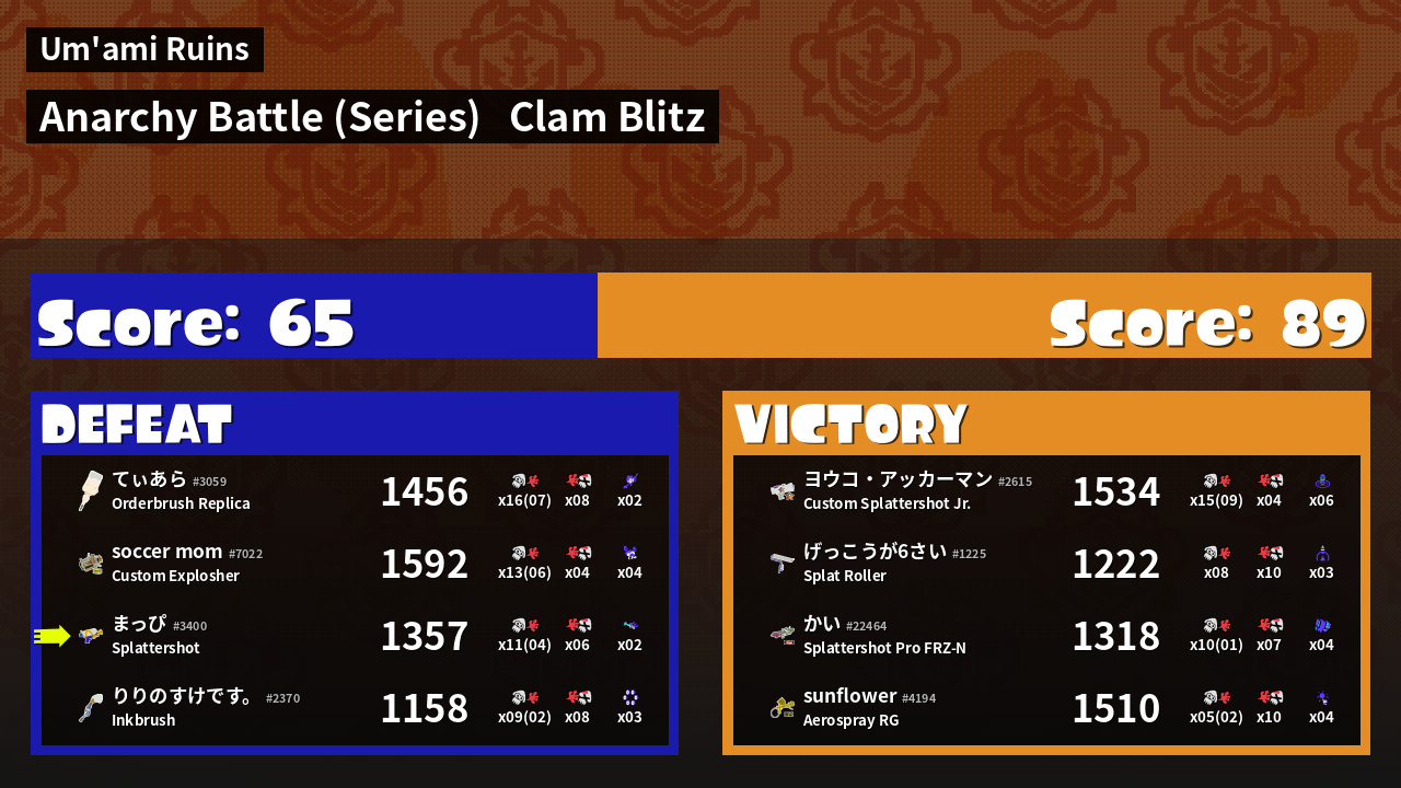 | Medals | #1 Clam Carrier #2 Super Jump Spot #2 Enemy Splatter |