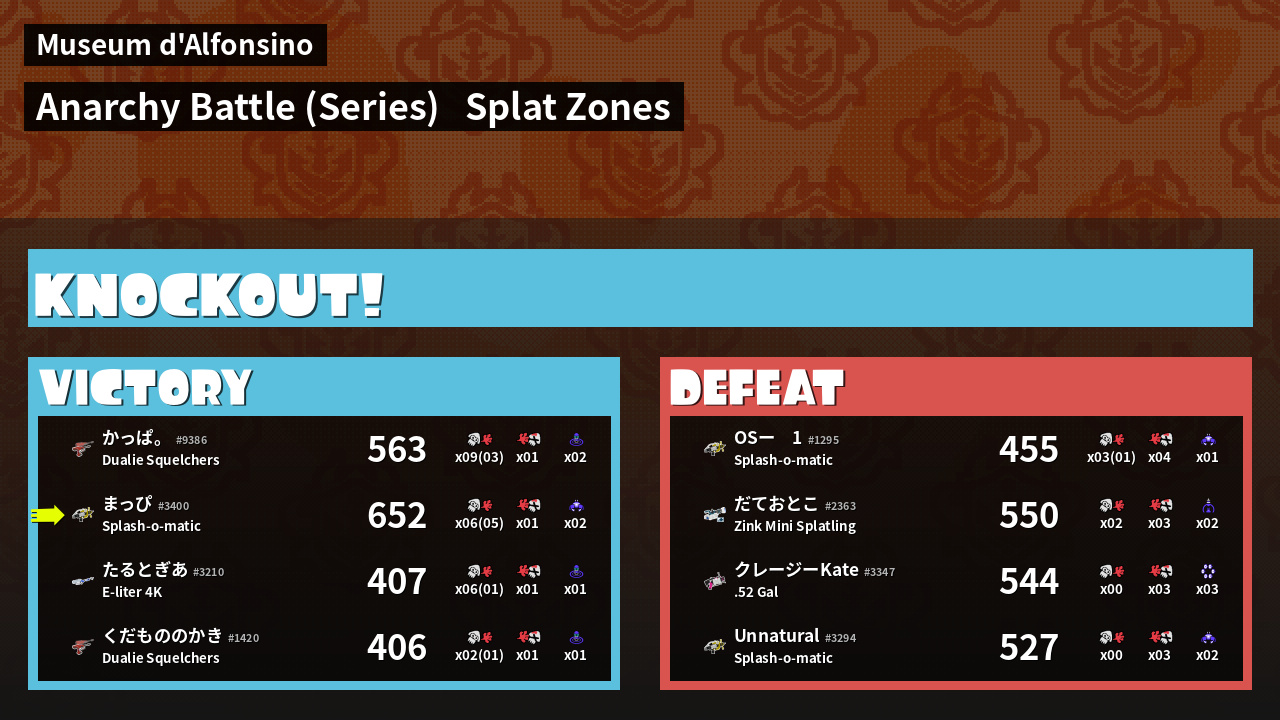 | Medals | #1 Turf Inker #1 Splat Assister #1 Damage Taker |