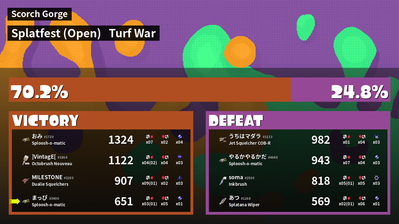 | Medals | #1 Base Defender #1 Ink Consumer #2 Enemy-Base Inker |