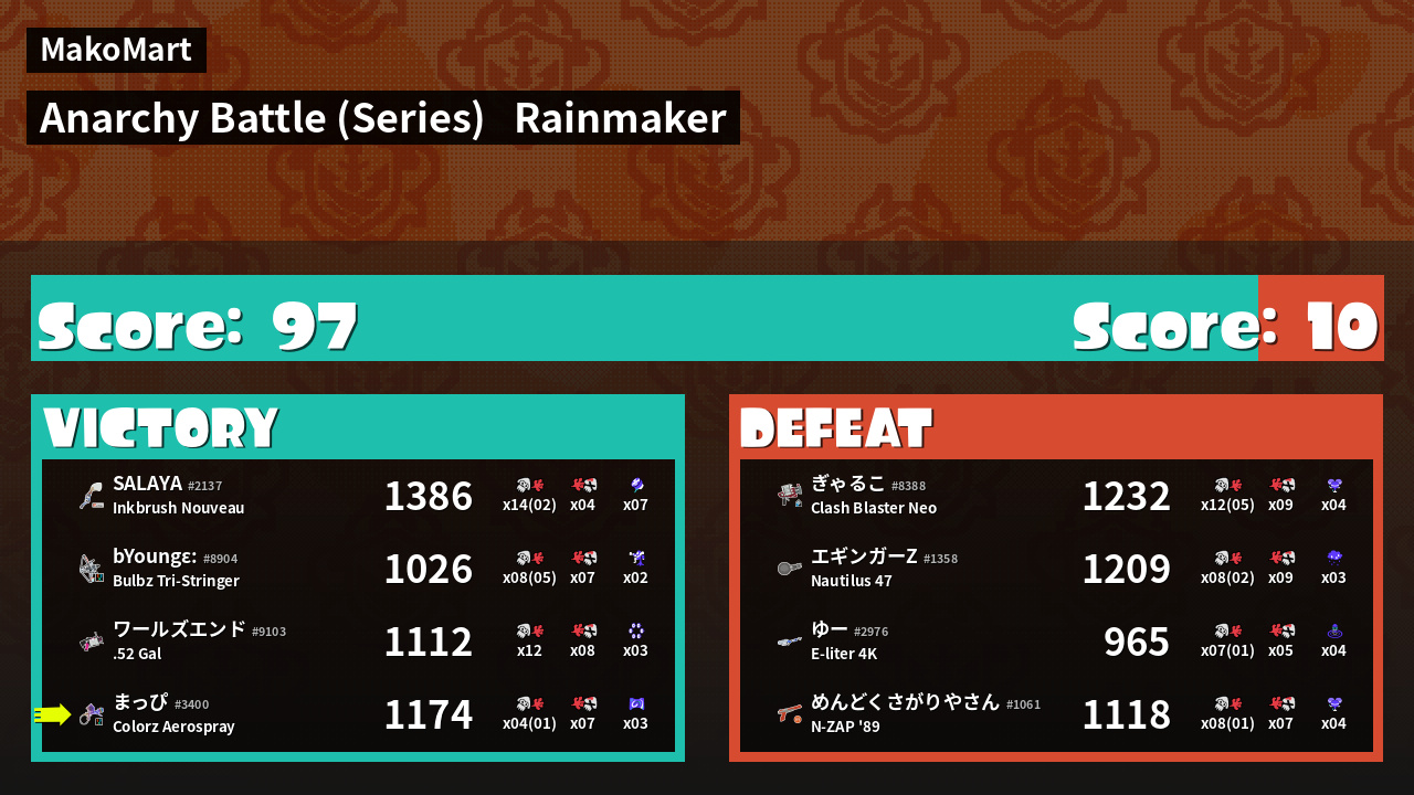 | Mode | Rainmaker - Anarchy Battle (Series) |