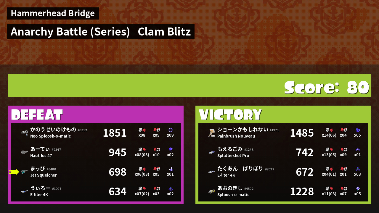 | Medals | #1 Popular Target #1 Splat Assister #1 Ink Consumer |