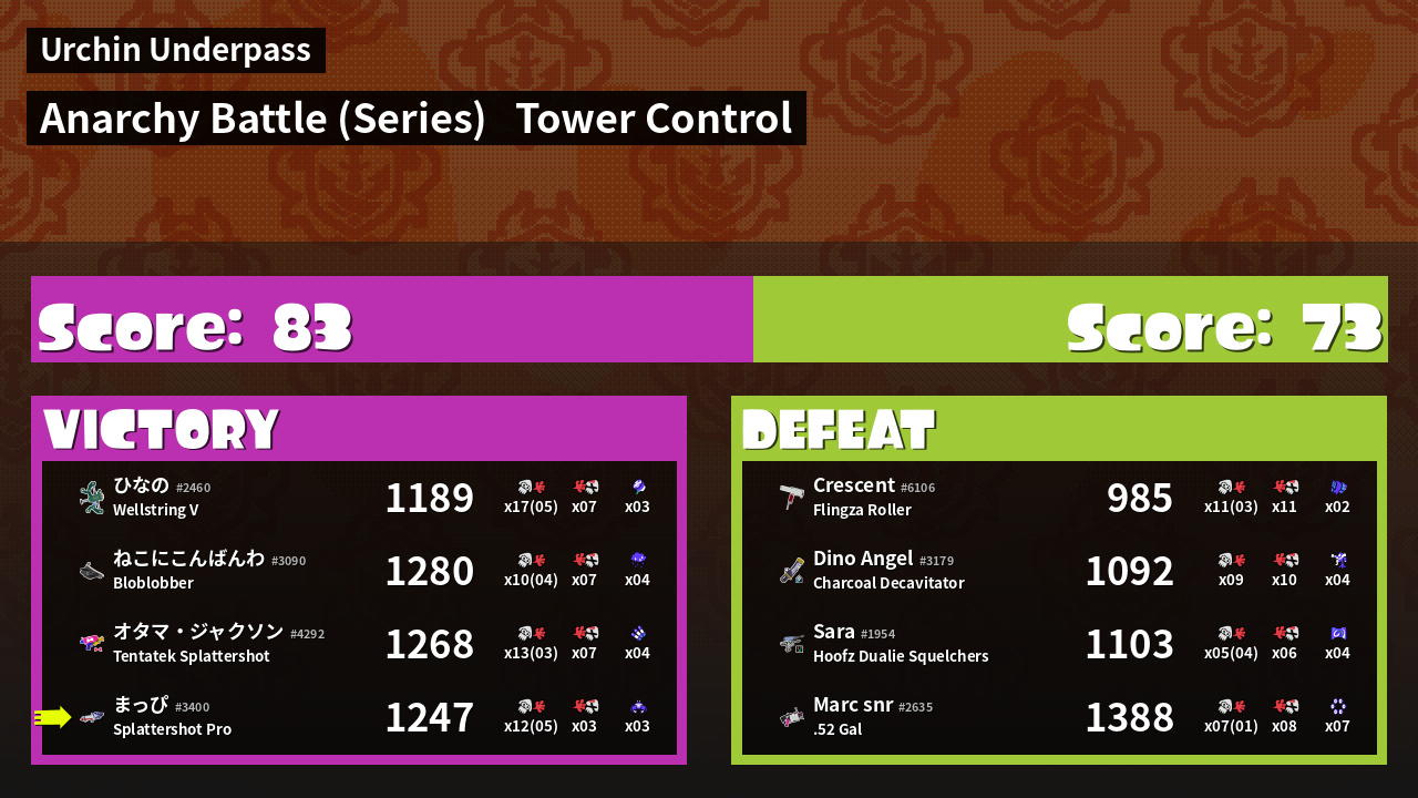 | Weapon | Splattershot Pro ( Angle Shooter / Crab Tank) |