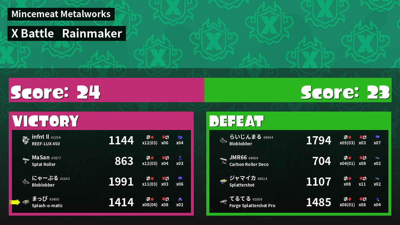 | Medals | #1 Super Jump Spot #1 Splat Assister #1 Rainmaker Carrier |