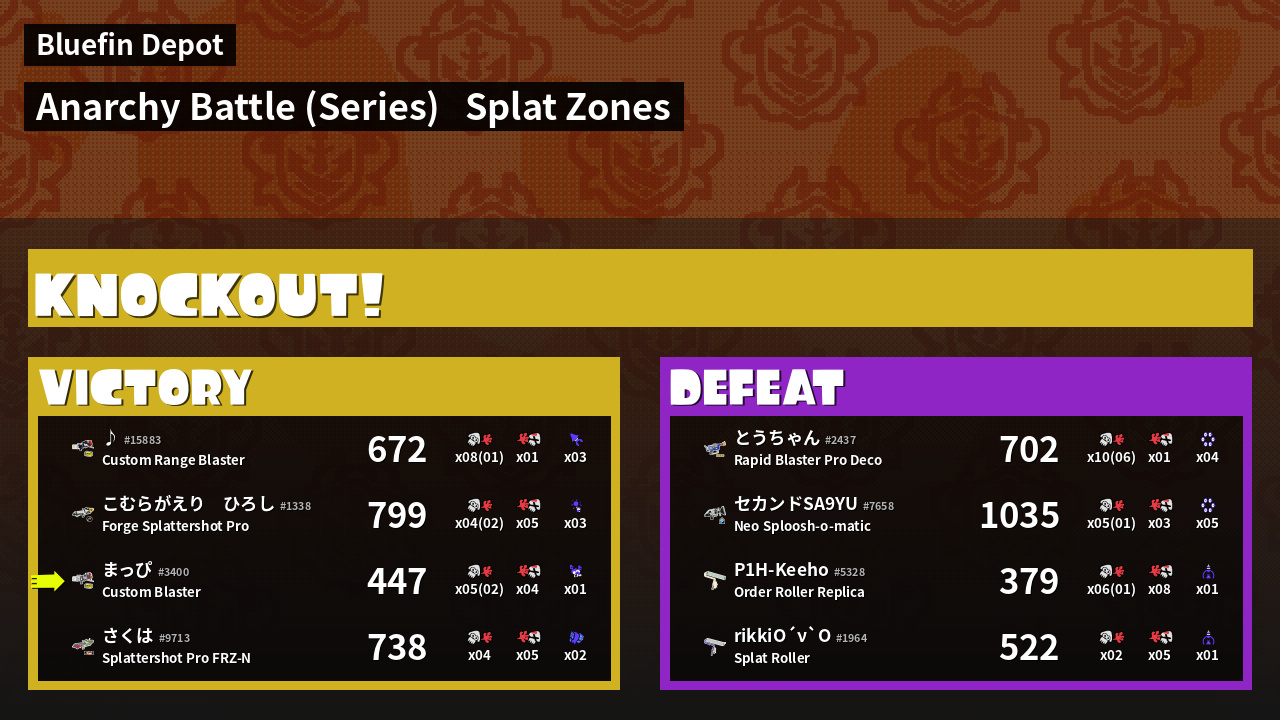 | Medals | #1 Splat Zone Guard #1 Splat Assister #1 Ink Consumer |