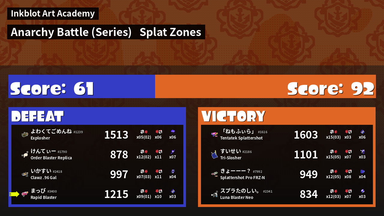 | Medals | #1 Popular Target #1 Damage Taker #1 Triple Inkstrike User |