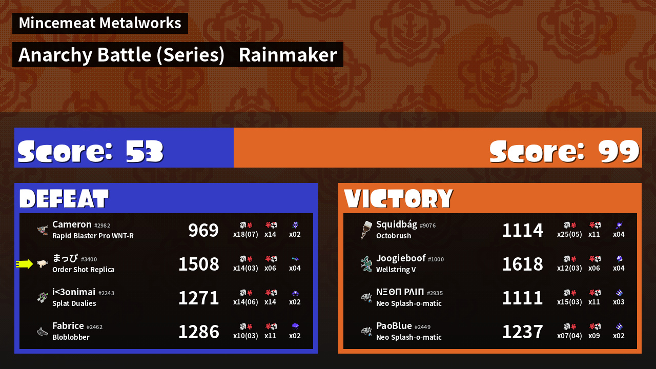 | Medals | #1 Turf Inker #1 Super Jump Spot #1 Enemy Splatter |