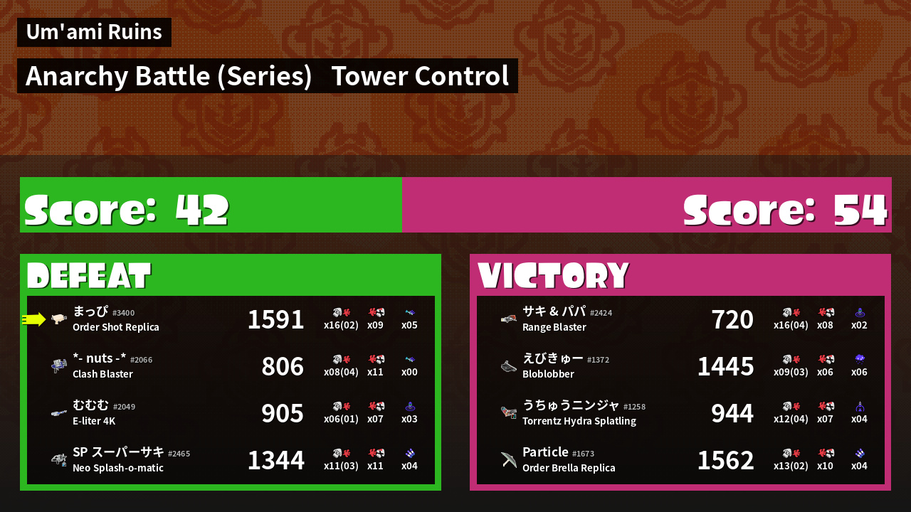 | Medals | #1 Overall Splatter #1 Turf Inker #1 Enemy Splatter |
