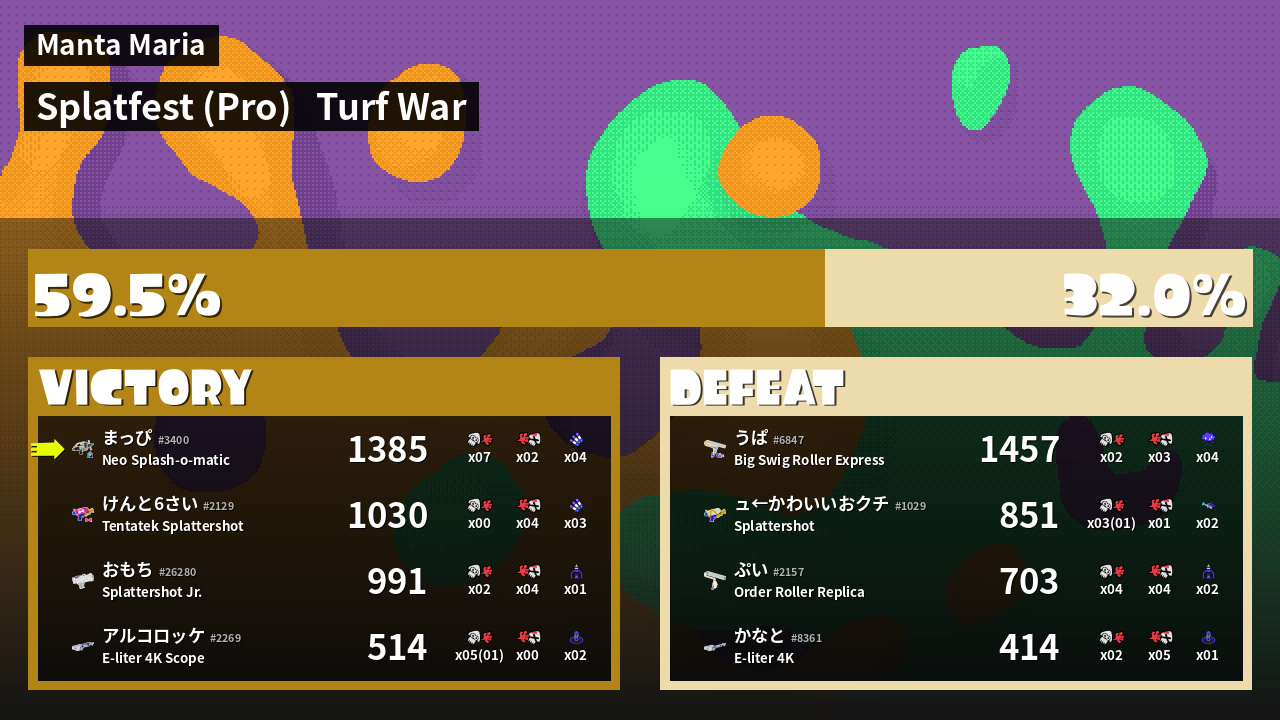 | Medals | #1 Overall Splatter #1 Turf Inker #1 Enemy-Base Inker |