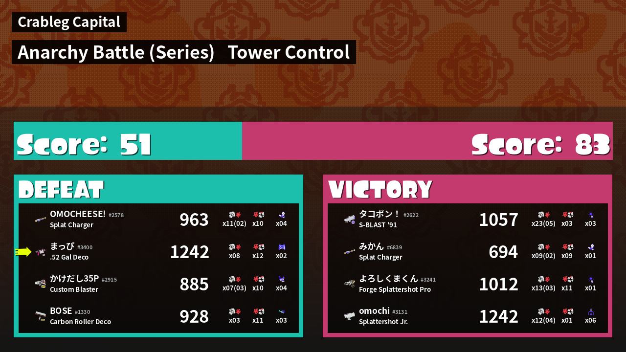 | Weapon | .52 Gal Deco ( Curling Bomb / Splattercolor Screen) |