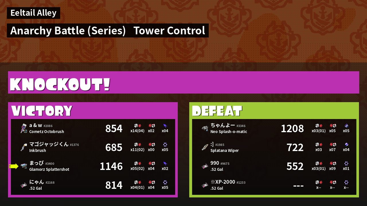 | Weapon | Glamorz Splattershot ( Burst Bomb / Kraken Royale) |