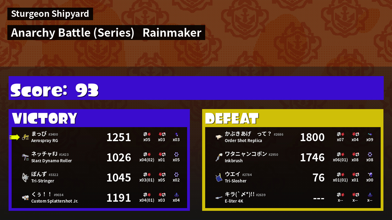 | Medals | #1 Overall Splatter #1 Turf Inker #1 Enemy Splatter |