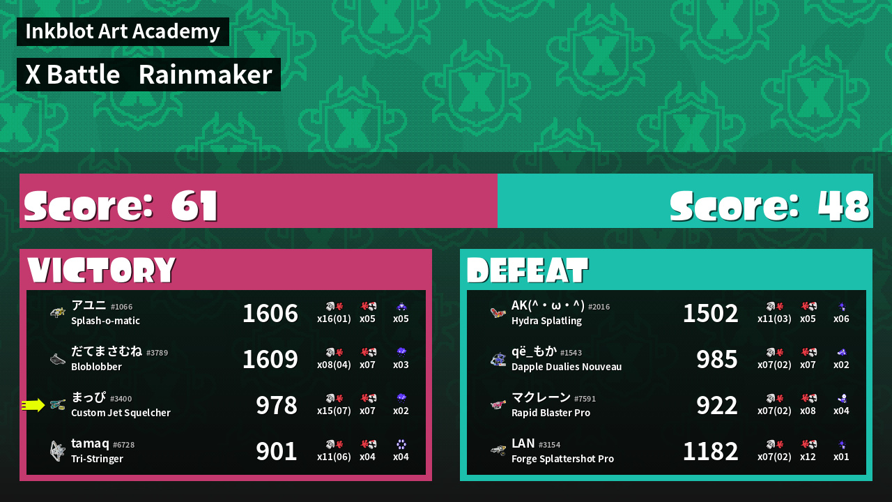 | Medals | #1 Splat Assister #1 Ink Consumer #2 Overall Splatter |