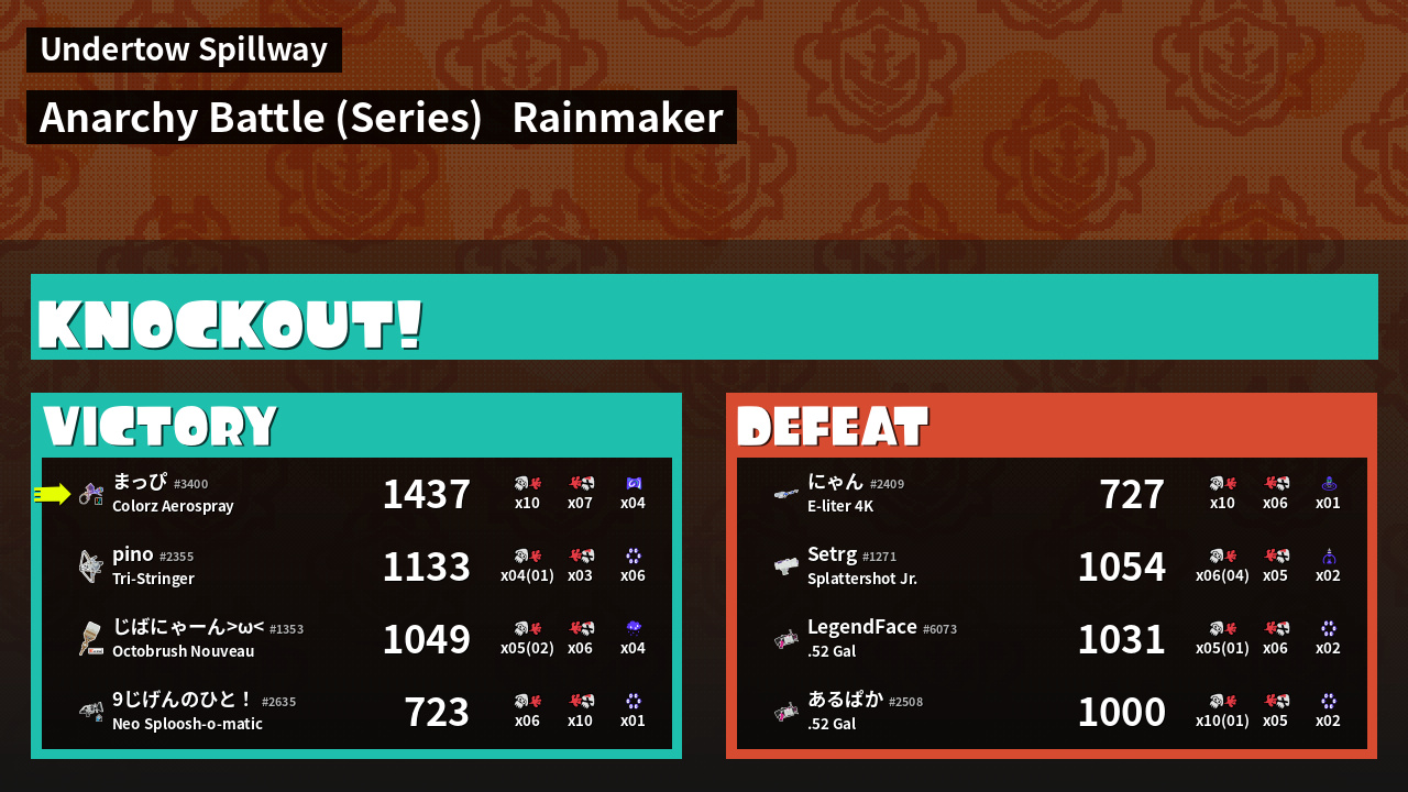 | Medals | #1 Overall Splatter #1 Turf Inker #1 Enemy Splatter |