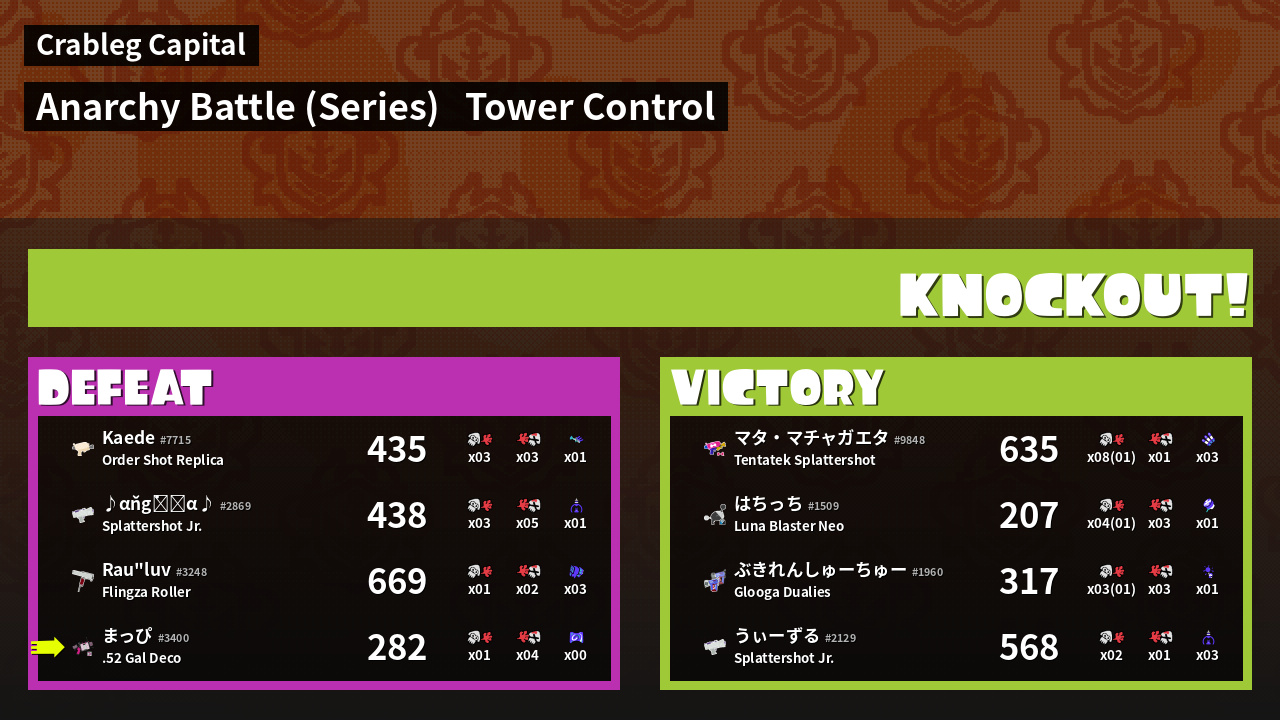| Weapon | .52 Gal Deco ( Curling Bomb / Splattercolor Screen) |